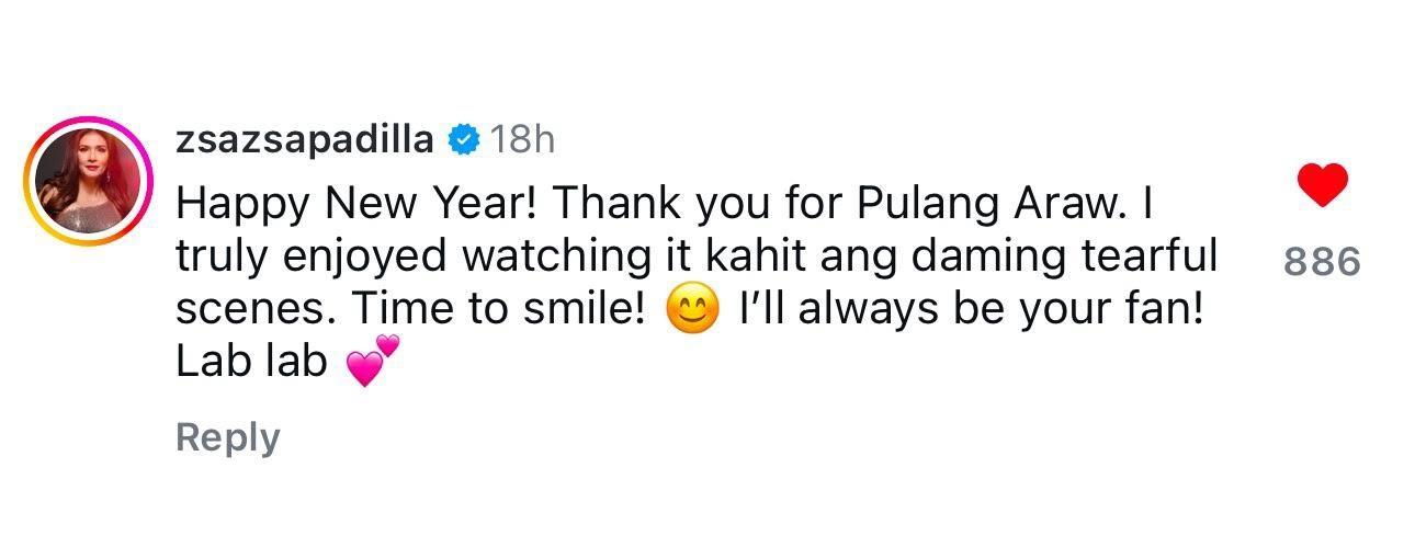 "Happy New Year! Thank you for Pulang Araw. I truly enjoyed watching it kahit ang daming tearful scenes. Time to smile! 😊 I'll always be your fan! Lab lab 💕," lahad ni Zsa Zsa.