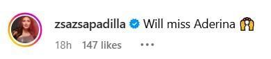 Sa farewell post ni Barbie noong finale ng Pulang Araw, isa si Zsa Zsa sa mga nag-iwan ng congratulatory messages.