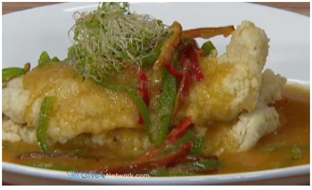 3. Sauté puree garlic,ginger until lightly brown,follow bell pepper, add chicken stock and thickened with slurry potato starch,add yellow powder,sugar simmer in 2 minutes place fried fish fillet and simmer for another 2 minutes season with salt,pepper.