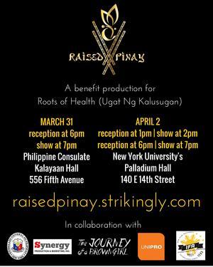 Roots of Health proudly presents "Raised Pinay", a community-centered benefit production based on original stories & performances by an all-Pilipina cast. There will be 3 shows: Thursday, March 31st, 6 PM at the Philippine Consulate, April 2nd, 1 PM at NYU Palladium, and April 2nd, 6 PM at NYU Palladium. Read more