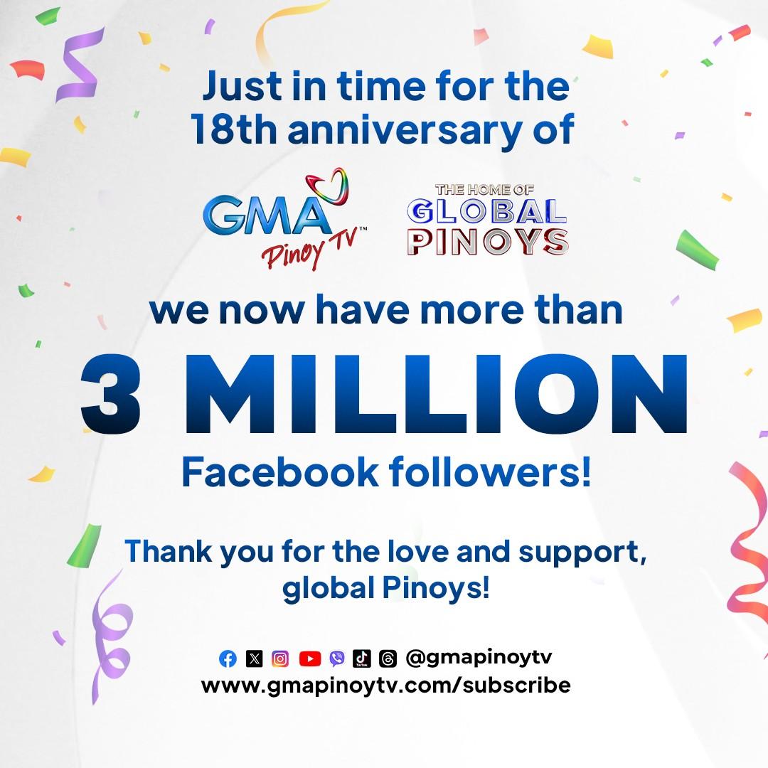 GMA Pinoy TV's Facebook page now has more than 3 million followers!