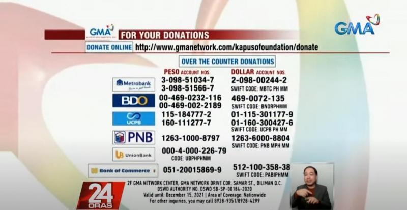 Maari ring magdeposito sa iba't ibang bank accounts ng GMA Kapuso Foundation, pati na sa Cebuana Lhuillier, PayMaya, GCash, Globe Rewards, at Metrobank credit card.