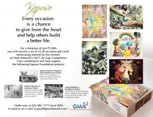 Send thoughtful & creative all occasion cards for your loved ones while helping the less privileged! Call (02) 982-7777 local 9903 on weekdays (M-F, 9 am-6 pm) or email gmaf@gmanetwork.com or send us a message on GMA Kapuso Foundation (Official FaceBook page). Read more