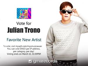 Julian Trono is nominated in the 'Favorite New Artist' category alongside Alex Gonzaga, Jason Dy, Jensen and the Flips and The Juans in the '2016 Myx Music Awards.' Julian says that he is overwhelmed to be nominated in the awards show.