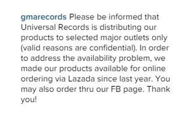GMA Records commented on Instagram, “Please be informed that Universal Records is distributing our products to selected major outlets only (valid reasons are confidential). In order to address the availability problem, we made our products available for online ordering via Lazada since last year. You may also order thru our FB page. Thank you!”