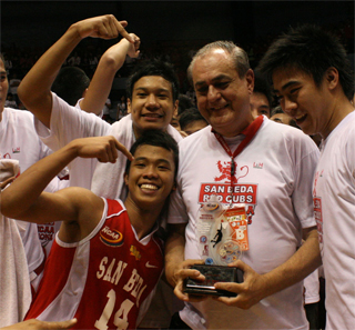 San Beda’s Ato Badolato, 2nd from right, holds his Coach of the Year trophy beside top player Amer Baser (No. 14) after the Red Cub’s title win in the 85th NCAA. GMANews.TV