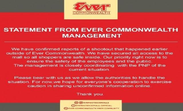 Naglabas naman ng pahayag ang pamunuan ng Ever Commonwealth at kinumpirma nila ang barilan na naganap umano sa labas ng mall.