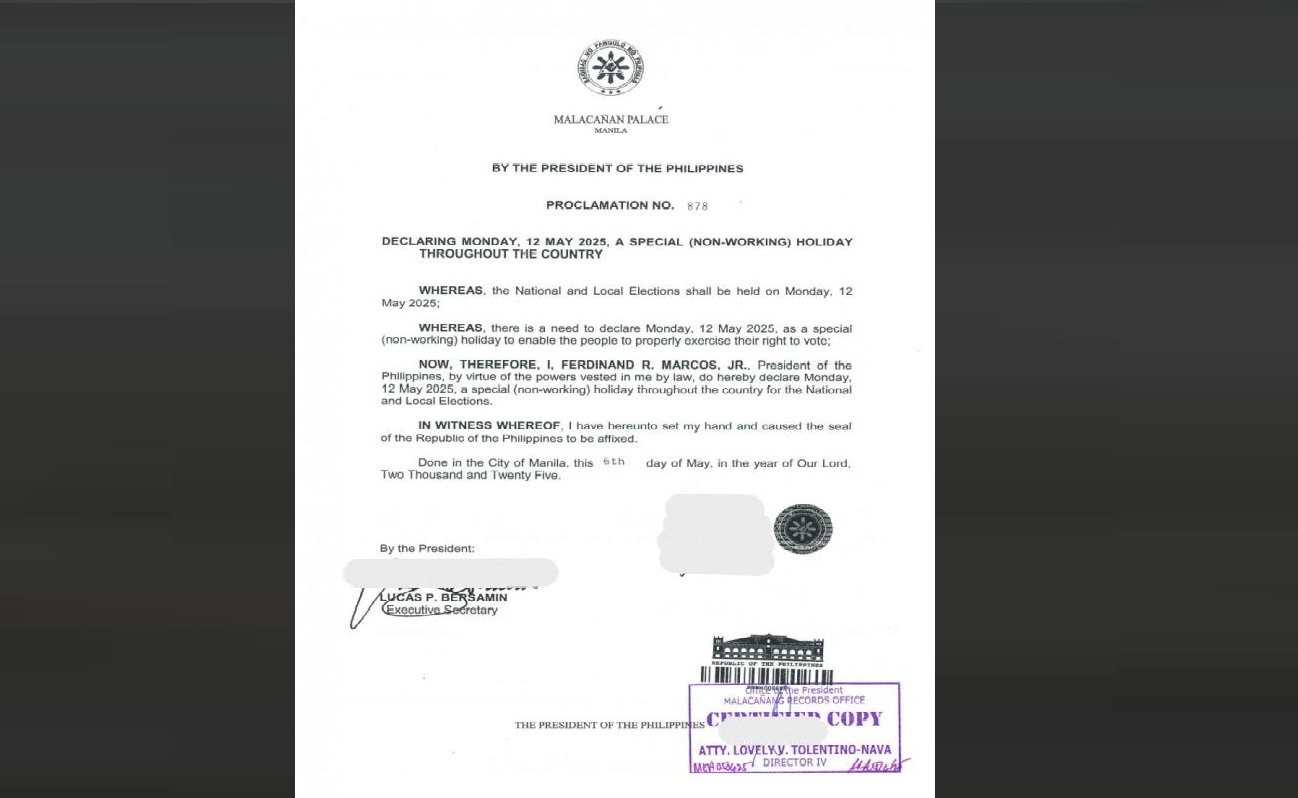Nakasaad sa Proclamation No. 878 na kailangang ideklarang special non-working holiday ang Mayo 12, para makaboto ang mga tao, na kanilang karapatan.