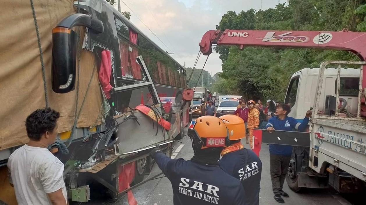 Nawasak ang unahan ng bus sa lakas ng pagkakabangga. Tumagal nang halos tatlong oras ang rescue operation para sa driver ng bus na naipit sa nayuping bahagi ng bus.