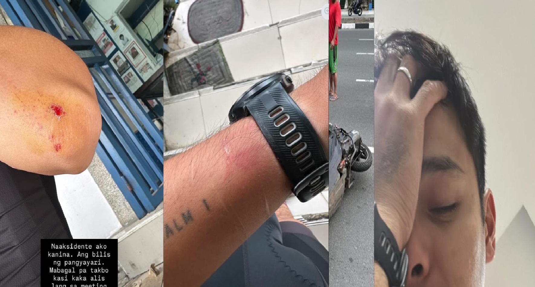 Sa Facebook, ipinost ni Kristoffer ang ilang larawan na makikita ang galos na kaniyang tinamo sa braso at siko. May motorsiklo rin na nakatumba na makikita sa post.