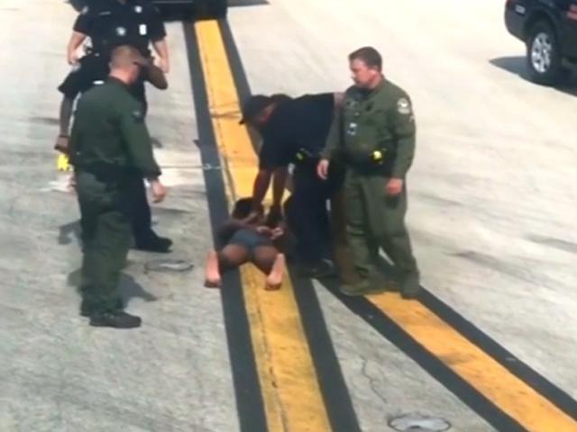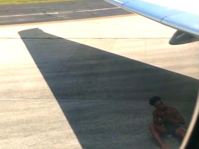 Nang hindi nakapasok, tumambay na siya at umupo sa runway hanggang sa dumating ang mga awtoridad para siya dakpin.