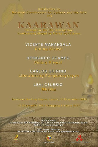 The National Commission for Culture and the Arts (NCCA) presents Kaarawan, an NCCA’s Birth Centennial Tribute to four National Artists: Levi Celerio (Music), Vicente Manansala (Visual Arts), Hernando Ocampo (Visual Arts) and Carlos Quirino (Historical Literature). The exhibit will open on December 12, 2011, Monday, 3:00 PM at the NCCA Gallery in Intramuros.