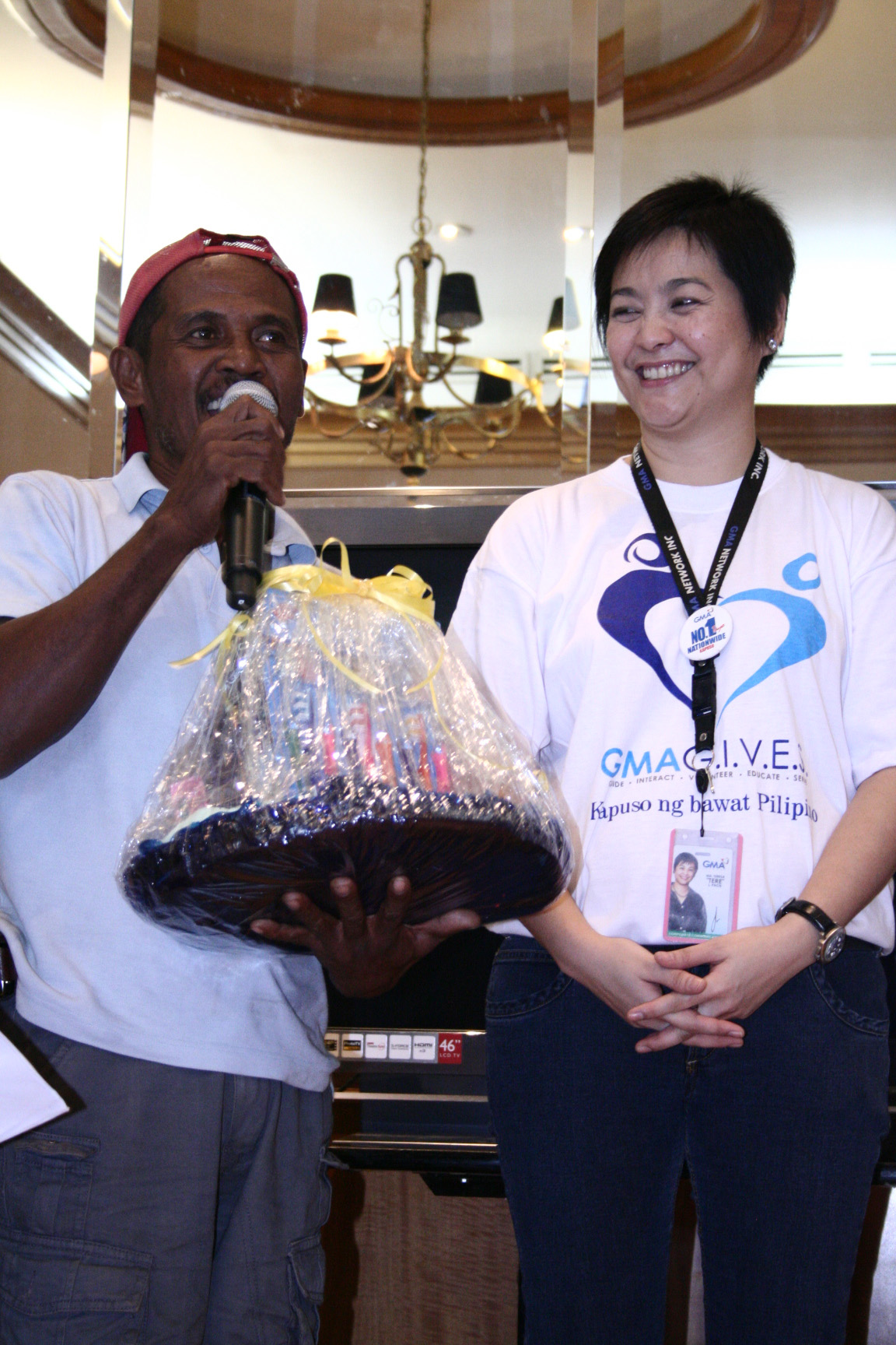 The families were brought to the GMA Network Center in Quezon City by the Third Mechanized Infantry Battalion stationed in San Jose, Tarlac. Lt. Col. Jun Torres, battalion leader, said the coordination of the Armed Forces of the Philippines with corporations like GMA introduces a "shift" in the military's strategy to restore order in the countryside by using "instruments of peace" instead of guns. "We link [our kababayans from] remote areas with organizations like GMA para mabigyan po sila ng pag-asa. Naniniwala po kami na kapag nabigyan natin sila ng pag-asa, mawawala ang problema -- titigil po ang digmaan," Torres said during the program. Hosted by comic Survivor duo Maey Bautista and Albert "Betong" Sumaya, the event was enlivened by presentations from Kapuso talents such as Tween star Bea Binene, Angel Satsumi (Pepito Manaloto), Bodjie Cruz (Blusang Itim), and Sean Samonte (Promil I-Shine winner). Protege grand champion Krizza Neri also rendered two songs for the audience together with her mentor, Aiza Seguerra.
