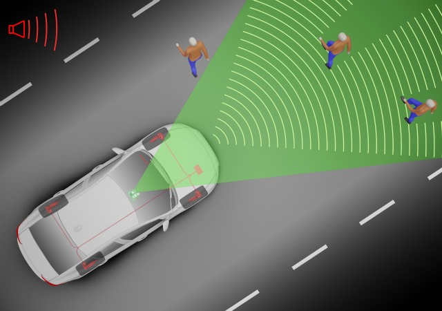 Pedestrian Detection with full auto brake consists of a radar unit integrated into the car's grille, a camera fitted in front of the interior rear-view mirror and a central control unit. The radar's task is to detect objects in front of the car and to determine the distance to them. The camera determines what type of object it is. In an emergency situation, the driver receives an audible warning combined with a flashing light in the windscreen's head-up display. At the same time, the car's brakes are re-charged. If the driver does not react to the warning and an accident is imminent, full braking power is automatically applied.