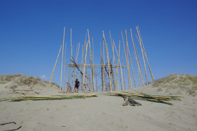 New, the recipient of residency grants to Singapore and Australia by the Ateneo Arts Awards, and his team have spent weeks under the summer heat in the sand dunes of Paoay, Ilocos Norte constructing his large scale installation art using indigenous materials such as bamboo, abaca rope and local textile inabel.