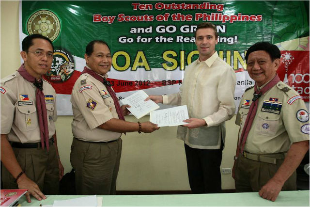 True to its decade long partnership and in celebration of 100 years in the Philippines, Coca-Cola Philippines continues to support the Boy Scouts of the Philippines (BSP) in promoting environmental stewardship and leadership among the youth. Coca-Cola Philippines renews its partnership of two major programs in the next five years (2012 - 2016); The Search for the Ten Outstanding Boy Scouts of the Philippines (TOBS) program - an annual event that bestows awards to impressive individuals in the Scouting community, and Green is Go! Go for the Real Thing! Project - a nationwide tree planting program launched in 2004.