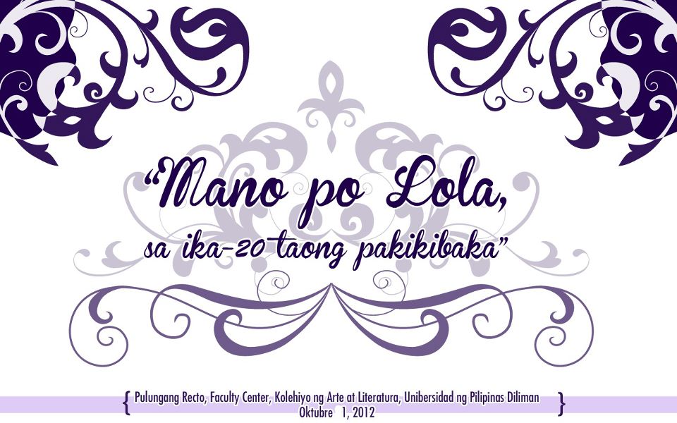 The event, Mano Po, Lola, will be held at Pulungang Recto, Faculty Center of UP Diliman on 1 October, the start of the International Day of Older Person, from 8 in the morning up to 12 noon.
