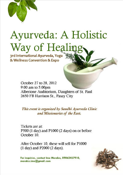 Now on its third year, Sandhi Ayurveda Clinic once again invites the public to learn more about Ayurveda, as well as other healing modalities like Theta Healing and H202 Therapy, in the 3rd International Ayurveda, Yoga and Wellness Convention and Expo on October 27 to 28, 2012 at the Alberione Auditorium, Daughters of St. Paul, 2650 F.B. Harrison St., Pasay City.