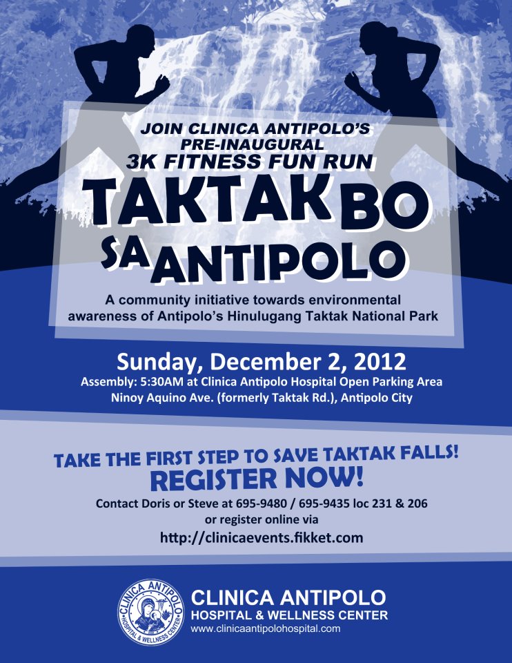 Clinica Antipolo invites the public to join "Taktakbo sa Antipolo," a three-kilometer fitness fun run to raise environmental awareness of Antipolo's Hinulugang Taktak National Park.