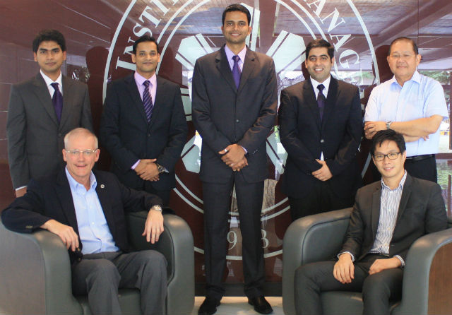 AIM President Steven J. DeKrey (seated, left), Washington SyCip Graduate School of Business Associate Dean Prof. Horacio Borromeo Jr. (standing, rightmost), and team mentor Prof. David Gulliver Go (seated, right) join the Hult Prize Shanghai Regional team composed of Ravindra Rapeti (standing, leftmost), Raj Bordia (standing, 2nd from left), Shivesh Guarav (center), and Saurabh Bathla (standing, 2nd from right).