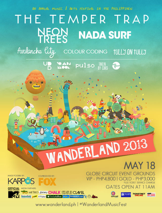 Get ready for one surreal summer experience as Karpos Multimedia Inc. proudly presents Wanderland, an annual outdoor music and arts festival with sights, sounds and a little something extra. Slated to rock music-loving Manila on May 18, 2013, this whole-day event is the first of its kind in the Philippines and will be the first major concert at the new Globe Circuit Events Ground in Makati. Wanderland makes its scorching debut this summer by bringing together the hottest indie pop and indie rock bands and up-and-comers, both foreign and local, all on one stage. All the rage activities also await revelers, such as performances by live art artists Anjo Bolarda x Martojaks, Secret Fresh and Thursday Room, inflatable slides, jousts and a Velcro wall.