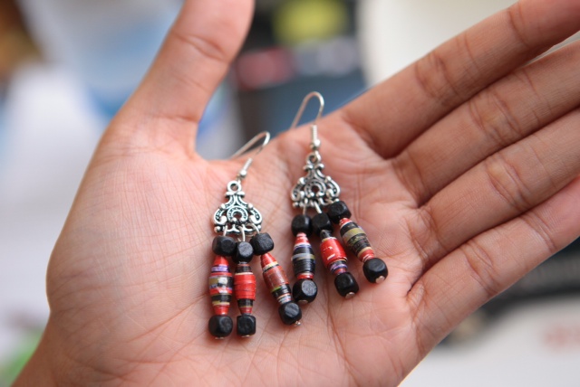 The activity involved tearing colorful pages from old magazines and rolling them up to form beads. These were then stringed into necklaces, bracelets and earrings. Here, Virlanie Foundation’s Marie Michel offer helpful tips to the volunteers.