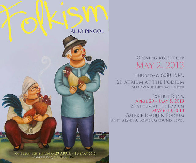 Having completed new works to his impressive oeuvre, Pingol will be holding a one-man exhibition at the Atrium of the Podium Mall in Ortigas Center from April 29 to May 5, and at Galerie Joaquin in Podium until May 10, 2013.