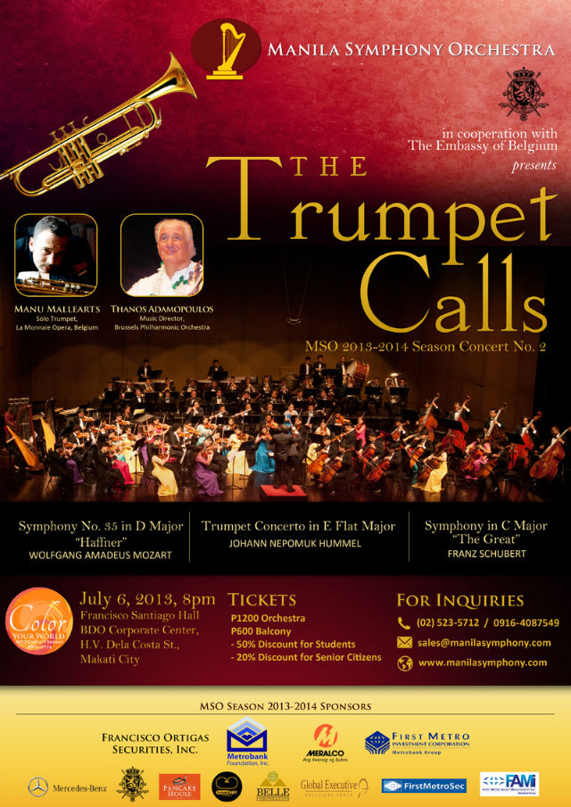 On July 6, 2013, the Manila Symphony Orchestra performs “The Trumpet Calls,” Concert No. 2 of the “Color Your World” 2013–2014 Concert Season. The concert features Belgian guest artists Manu Mallearts, trumpet, and Thanos Adamopoulos, guest conductor. The concert will be at 8:00 p.m. at the Francisco Santiago Hall, BDO Corporate Center, Makati. In this concert, the MSO explores golden themes of majesty and triumph with a performance of Mozart’s Symphony No. 35 “Haffner,” Hummel’s Trumpet Concerto in E Flat Major, and Schubert’s Symphony No. 9 in C Major “Great Symphony.”