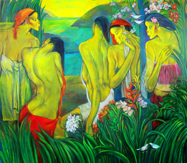What esteemed painter Lydia Velasco, does in this, her latest one-woman exhibition is to embark on a route to define her own vision of Paradise. She creates new works of astounding beauty, a world of lush foliage, abundant waterfalls and colorful flowers. Her concept is to present her interpretation of paradiso via her garden scapes and merge these with her female figures. Velasco, a Modernist master in her own right, navigates the levels of Paradiso in her own creative and artistic terms.