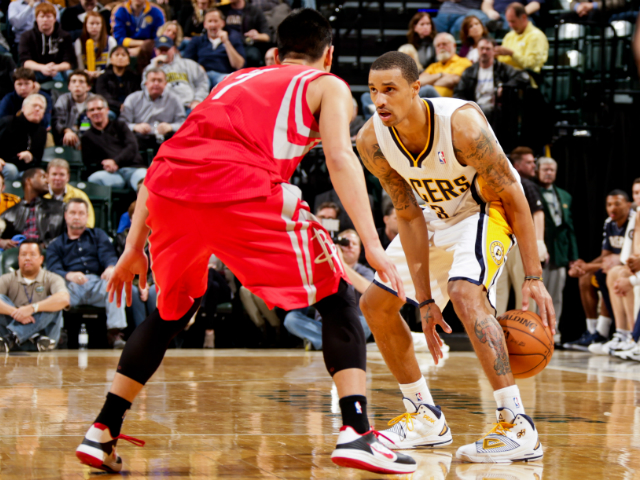 Houston Rockets point guard Jeremy Lin (L) sizes up Indiana Pacer George Hill. NBA Philippines