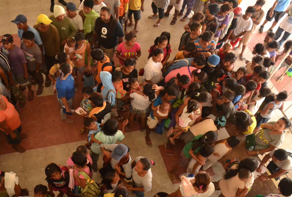 "Evacuees" gather at the Tacloban Convention Center, the targeted evacuation center.