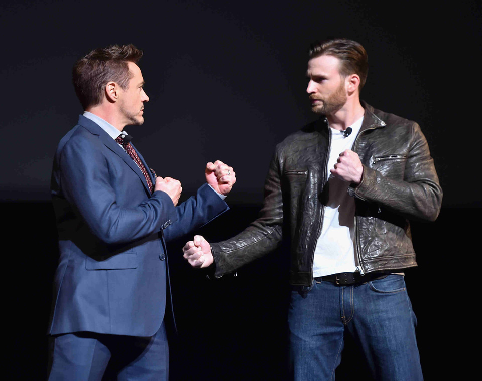 Robert Downey Jr. and Chris Evans at the Marvel event on Oct. 29, where the Marvel Cinematic Universe's Phase 3 was announced.