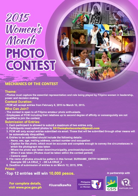 For the full mechanics of the contest, kindly visit http://pcw.gov.ph/event/2015-womens-month-photo-contest.