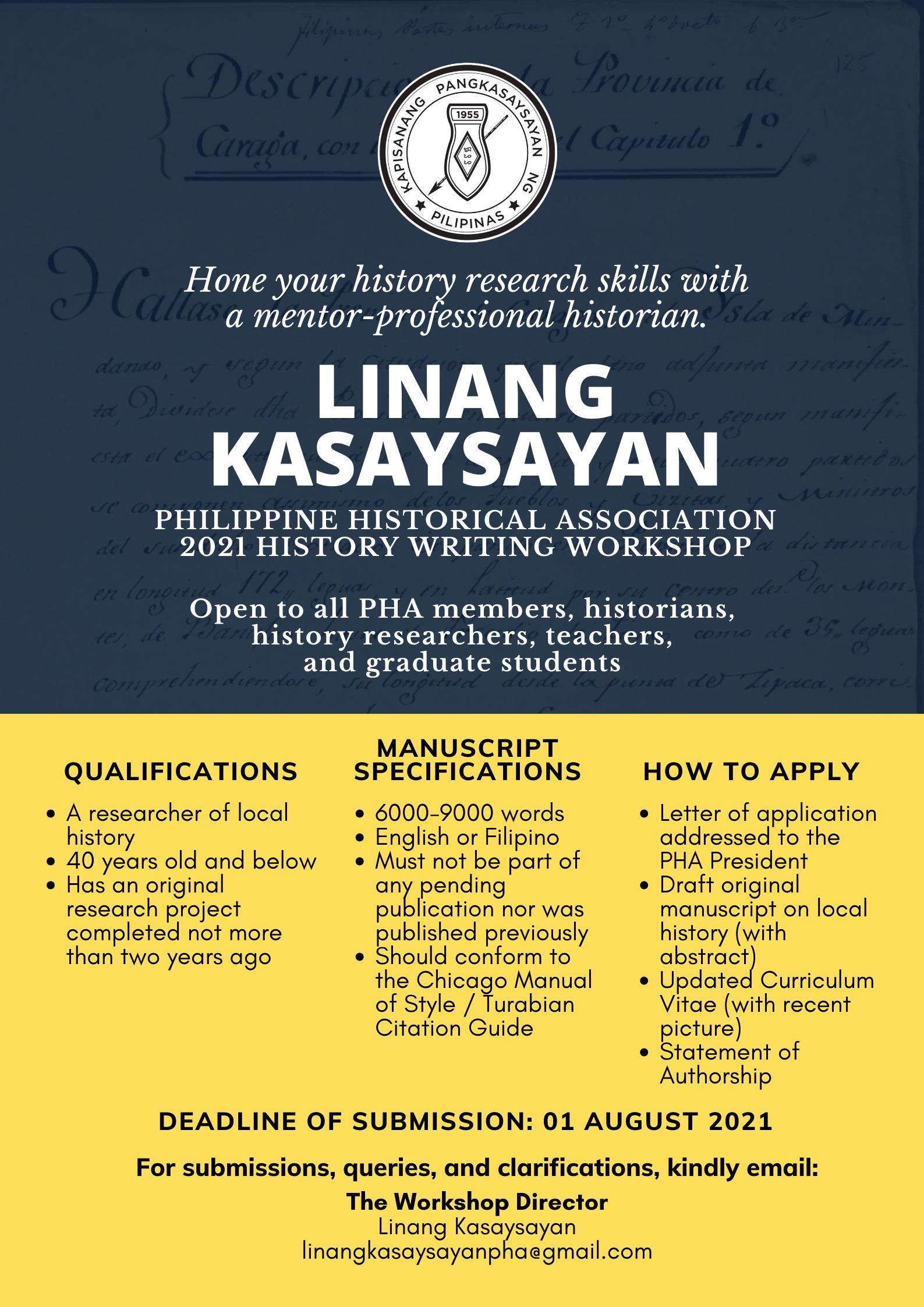 The Philippine Historical Association (PHA) invites all its members, historians, history researchers, teachers, and graduate students to submit original and unpublished papers with focus on local history to the Linang Kasaysayan: History Writing Workshop 2021.
