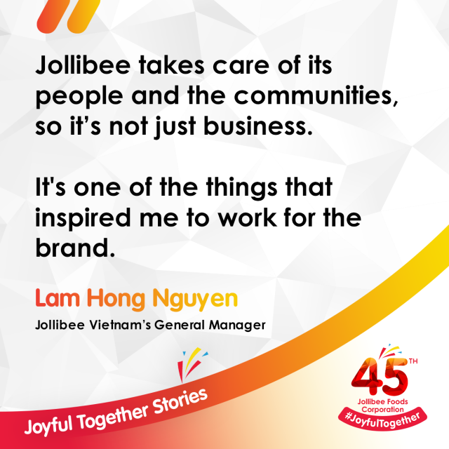As the Jollibee Group marks its 45th anniversary this year, we celebrate Lam Hong Nguyen as one of the people behind Jollibee Vietnam's inspiring story—from his beginnings as a crew member to his current role—alongside the growth of the local food industry, culture, and community.
