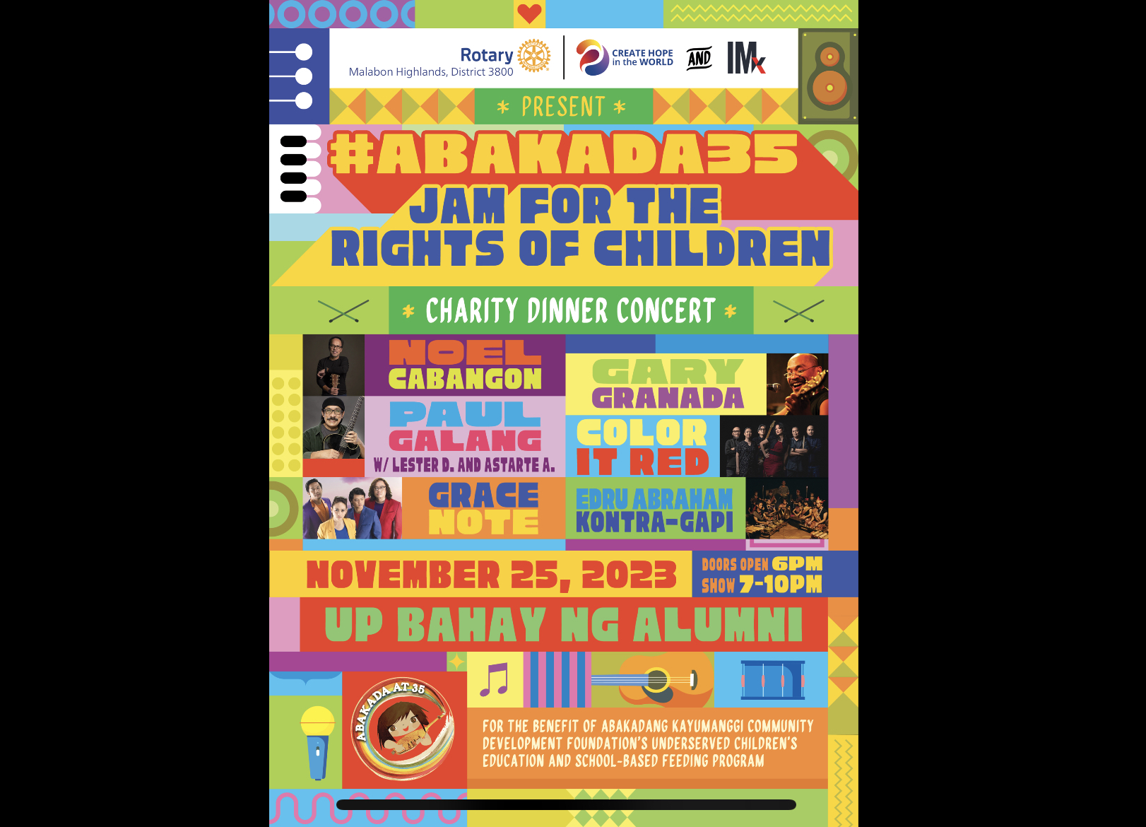 The fundraising event organized by Rotary Club of Malabon Highlands and IMx Creative Agency entitled #Abakada35 Jam for the Rights of Children will feature Noel Cabangon, Gracenote, Gary Granada, Color it Red, Paul Galang and Edru Abraham with Kontra-Gapi.