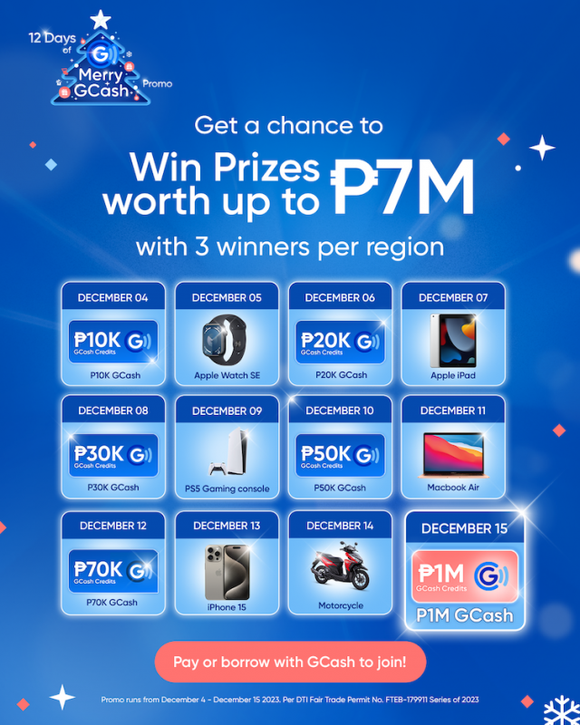 MANILA, Philippines – GCash invites you to be part of the 12 Days of Merry GCash celebration. Bringing plenty of merry experiences and exciting surprises every day, it’s the biggest giveaway of the season – and every GCash user from all regions has a chance to be a winner.