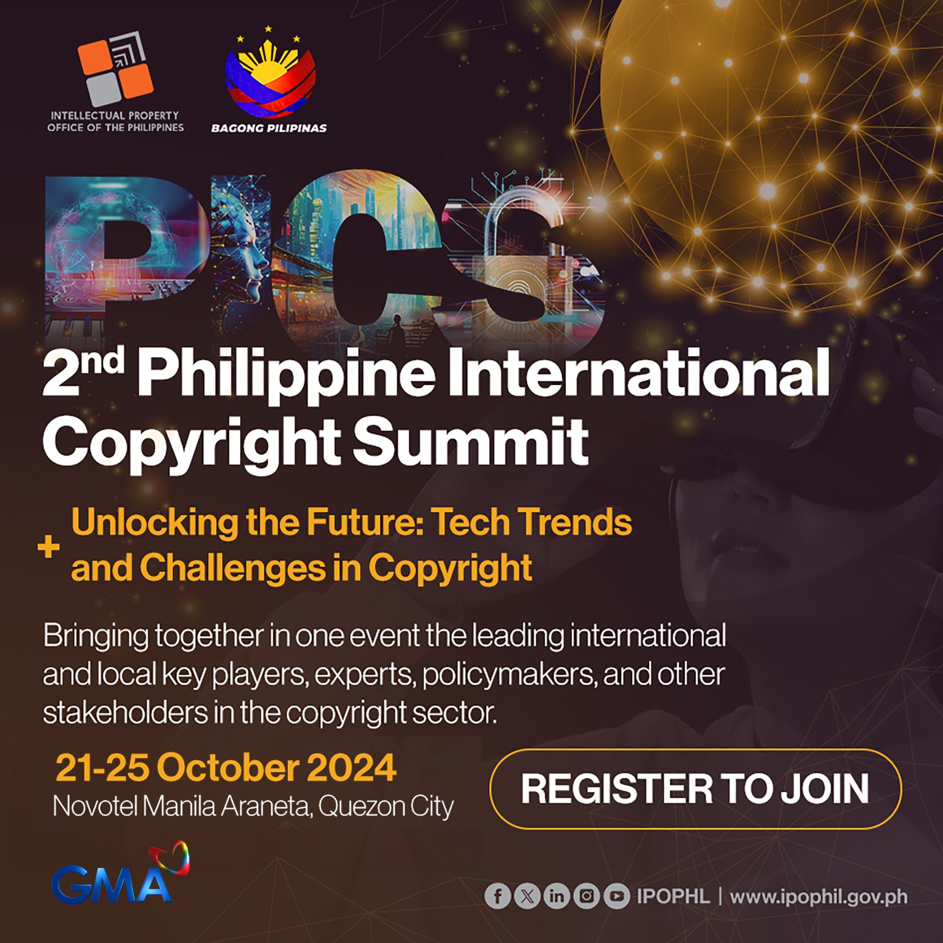 These and other topics relating to copyright laws will be covered at the 2nd Philippine International Copyright Summit (PICS) slated on October 21 to 25, 2024 at Novotel Manila Araneta in Cubao, Quezon City.