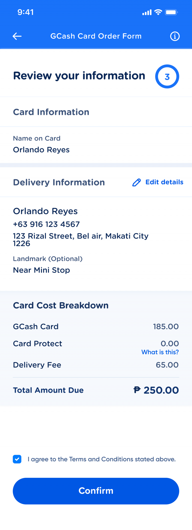 5. Agree to the Terms and Conditions and confirm your payment. Ordering a GCash Card costs PHP250 inclusive of delivery fees.
