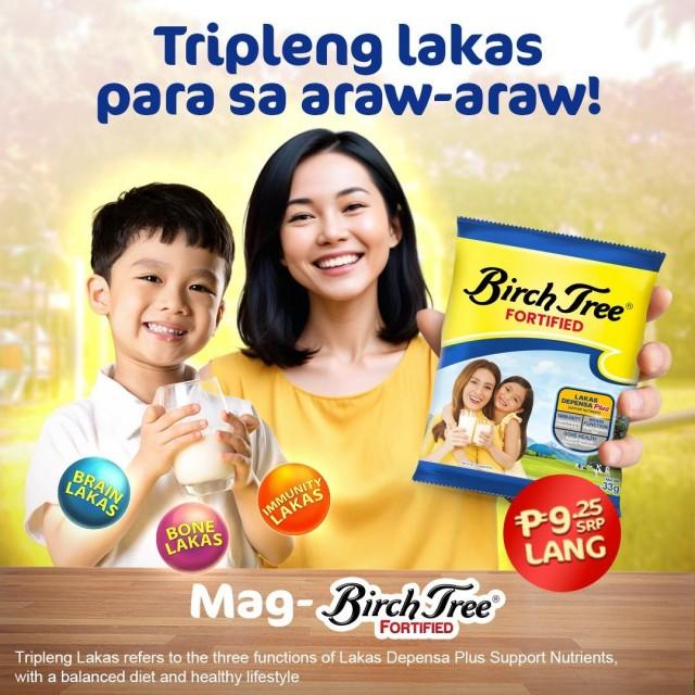 Birch Tree Fortified has been a trusted milk brand for generations of Filipino families. With Lakas Depensa Plus, Birch Tree is not only an excellent source of brain-friendly zinc but is also fortified with vitamins A and C for immunity, as well as calcium and phosphorus for bone health —providing TRIPLENG LAKAS: Brain-Lakas, Bone-Lakas, and Immunity-Lakas.