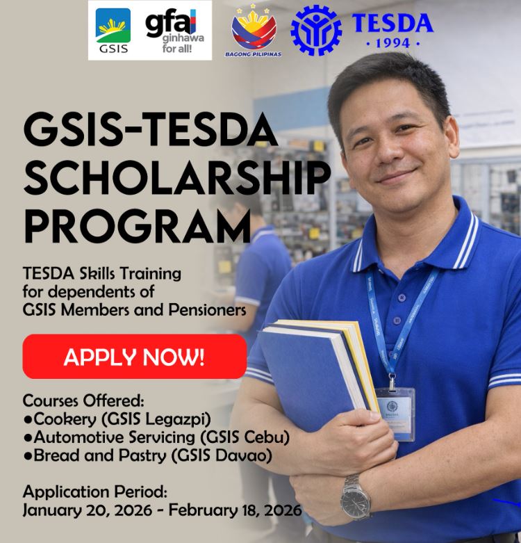 The Government Service Insurance System (GSIS), in partnership with the Technical Education and Skills Development Authority (TESDA), is opening applications for a new scholarship program that will equip unemployed dependents of GSIS members and pensioners with job-ready skills in Legazpi, Cebu, and Davao.