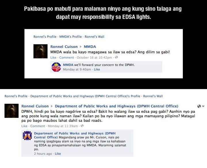So who's really in charge of EDSA's streetlights? This was the question on many online Filipinos' minds when the Metro Manila Development Authority (MMDA) and the Department of Public Works and Highways (DPWH) pointed at each other when asked by one concerned netizen whom to contact concerning the maintenance of the highway's lighting. Facebook user Ronnel Cuison posted on the official MMDA page to complain about the darkness on EDSA at night due to lack of functional streetlights. The MMDA's social media team responded, saying they would recommend Cuison's concern to the DPWH. Cuison then posted on the DPWH's Facebook page a paraphrased version of his first post, only to be pointed back to the MMDA.