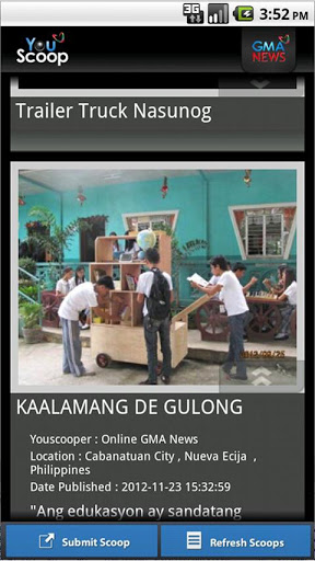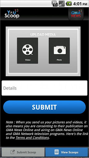 Many YouScoopers have had to rush to Internet cafes to send their scoops after covering a fire or other newsworthy event. Now armed with a new app on their smartphones, they don't have to leave the scene anymore. GMA News has launched the first mobile application for YouScoop, its citizen journalism arm. The YouScoop for Android app, which currently runs on Google’s Android operating system version 2 .2 and up, allows users to register as a “YouScooper” and easily share photos and videos of newsworthy events with GMA News.