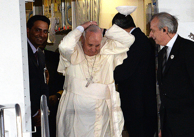 As a roar of applause accompanied his dramatic exit from his plane, after he teasingly looked out the window for several minutes, a sudden gust of wind blew off the papal skull cap. Pope Francis grabbed at the empty air as his cap disappeared downwards out of the TV frame.