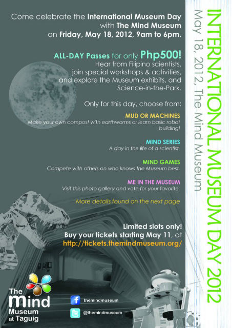 The Mind Museum in Taguig City offers a discounted rate on all-day passes. For P500, visitors can attend talks by Filipino scientists, join special workshops and activities, and explore the exhibits and the museum's Science-in-the-Park. Special interactive exhibits will be set up only on May 18. Visitors can make their own compost with earthworms, learn basic robot building, or compete with others on who knows the museum best. Limited slots are available. To buy tickets, visit the website.