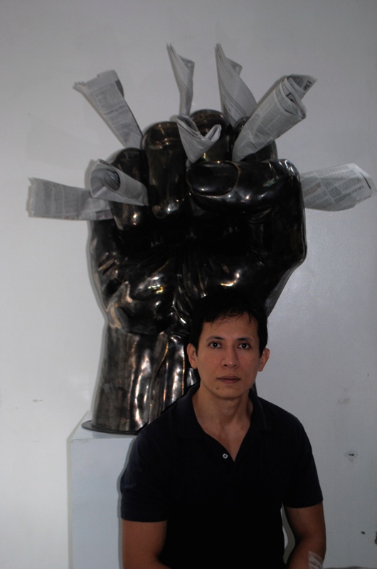 Juan Sajid Imao with his hammered brass sculpture titled "Daily Challenges." Sining PSE