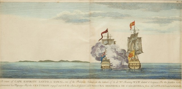 A View of Espiritu Santo, on Samal, one of the Philippine Islands. The sea battle between Admiral Anson's flagship Centurion and the Spanish galleon Nostra Seigniora de Cabadonga off the island of Samal, which ended in the capture of the Cabadonga. Map by George Anson, 51 x 59 cm. Mariano Cacho, Jr. Collection.