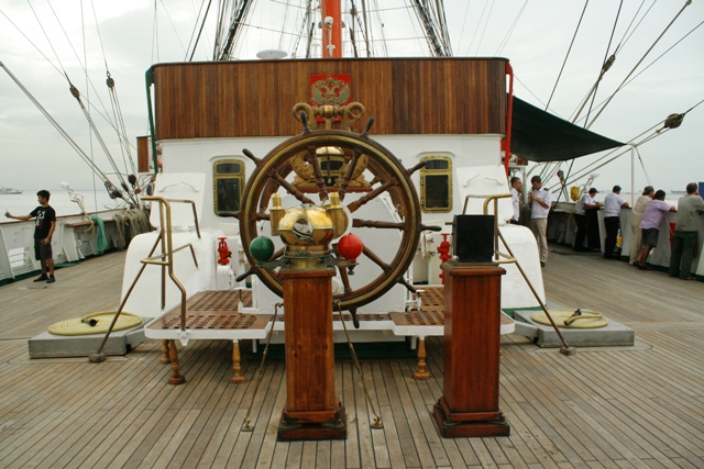 Even the ship's wheel had golden inlays engraved with the vessel's former names. According to the Sedov website, it was originally called Magdalene Vinnen II when it was first launched in 1921. It became the Kommodore Johnsen in 1936 after it changed owners, and finally was named Sedov in 1945 when it came under the ownership of the Soviet Union.