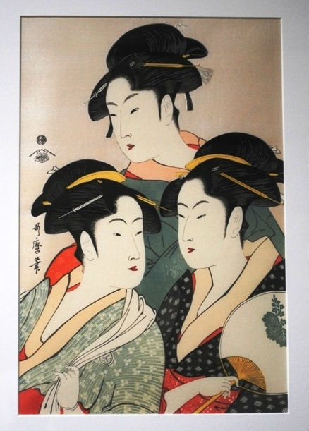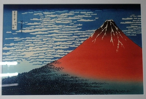 Sharaku’s “Otani Oniji as the Servant Edobei,” Utamaro’s “Three Favorite Beauties,” Eishi’s “The Geisha Itsutomi” from the series “Selected Geisha of the Gay Quarter,” Hokusai’s “Red Fuji” from the series “Thirty-Six Views of Mt. Fuji” are four of the most famous ukiyo-e in this exhibition.