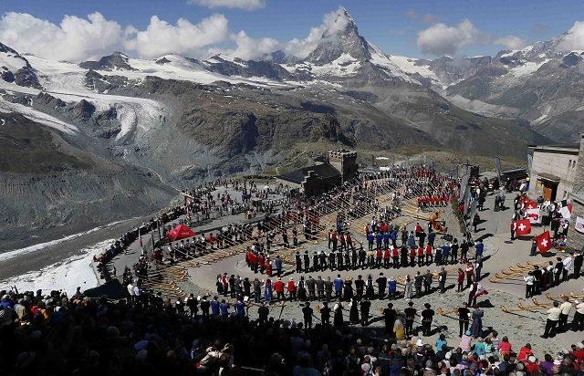 A total of 508 alphorn players stood in front of the Matterhorn in Switzerland to break the world record for the largest ensemble of people playing the alphorn. REUTERS/Ruben Sprich